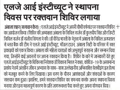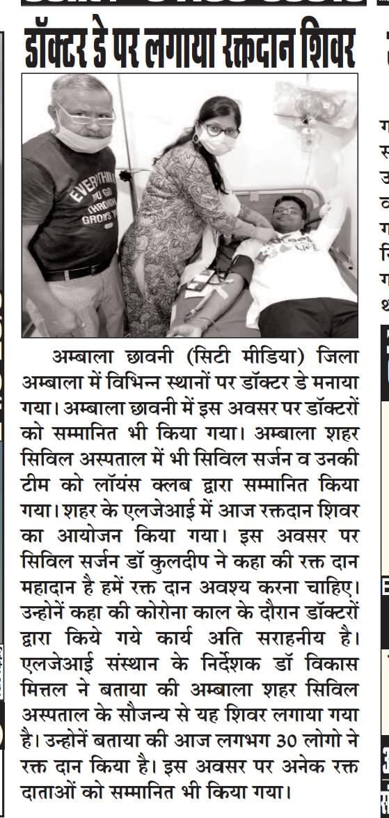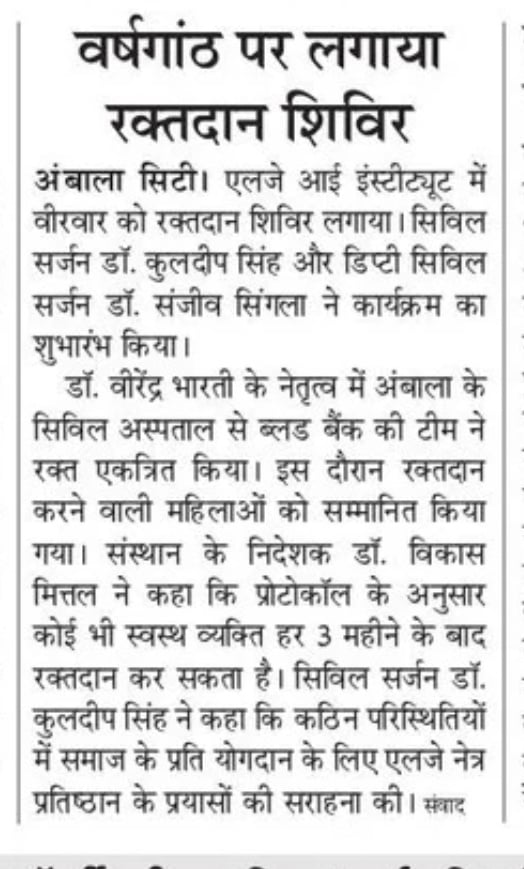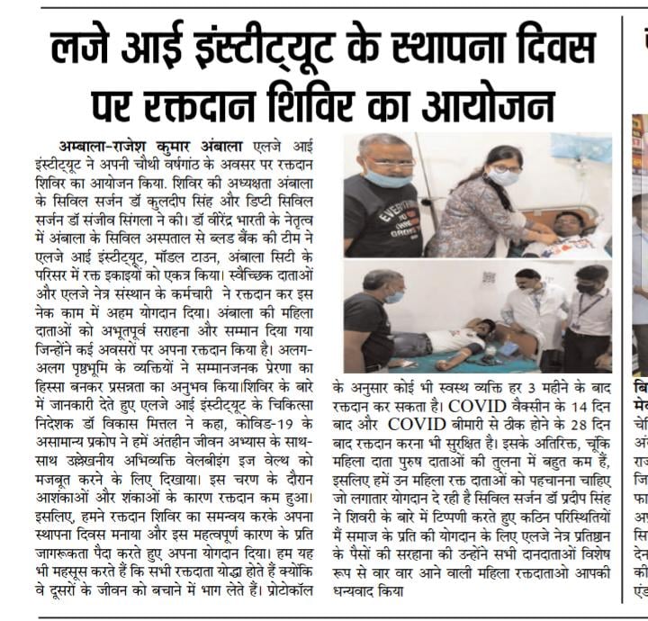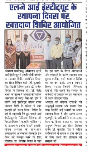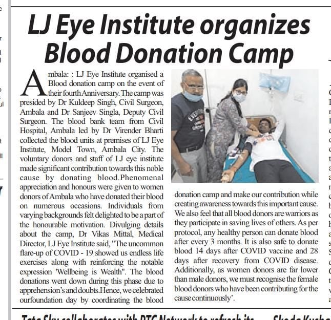 LJ Eye Institute 4th Foundation Day & Doctor’s day celebrations. On this day LJ Eye Institute organise a blood donation camp which was inaugurated by Civil Surgeon (Ambala) Dr. Kuldeep Singh. 30-Units of blood has been donated on this day.